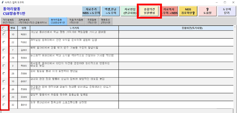 자동 작성할 학생을 선택 후 종합의견 일괄생성 버튼을 클릭합니다.