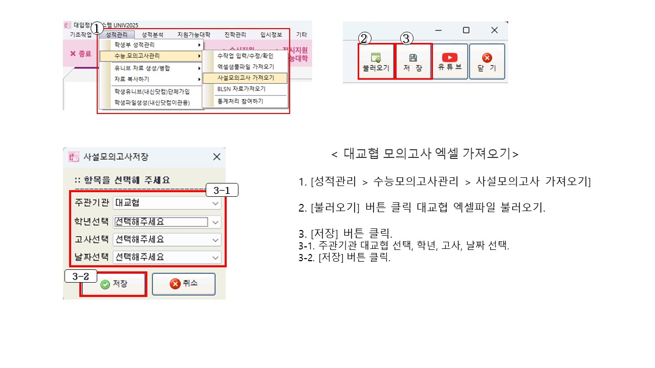 [성적관리 > 수능모의고사관리 > 사설모의고사 가져오기] 메뉴에서 [불러오기] 버튼으로 엑셀불러온 후