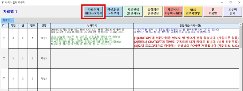 도우미 프로그램에서 NEIS로 자동복사 기능을 이용할 수 있습니다.